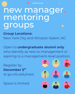 New Manager Mentoring Groups are for those who are grappling with these questions and thinking about how to grow both personally and professionally. Together with a small group of committed Wake Forest alumni, you will discuss books, articles, videos, and podcasts to inform your thinking; share strategies and feedback; and receive one-on-one coaching, so that you may identify strengths and key areas of growth to move to the next level for you personally and professionally.