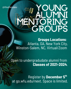 Since 2013, Young Alumni Mentoring Groups have provided a unique opportunity for hundreds of Wake Forest young professionals to come together for facilitated conversation, reflection, action planning, and to make meaningful connections about life and work.
