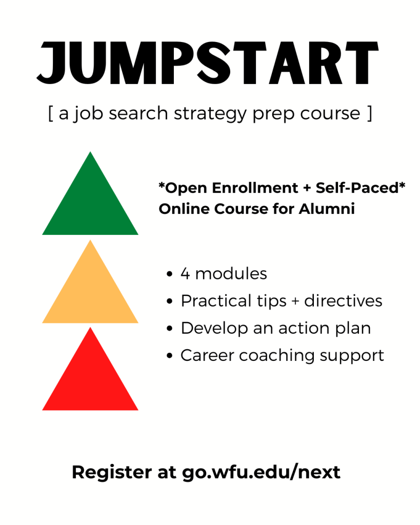 *Please note this offering is only for alumni who are graduates from College of Arts & Sciences programs. Grads from any School of Business program, law, med school, etc. should reach out to their respective programs for career assistance! Current WFU students should contact the OPCD.