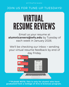 Tune-Up Tuesdays will be back in the new year, starting on January 6, 2026! The start of a new calendar year is a great time to update your resume with recent accomplishments! We’ll be reviewing any incoming resumes that we receive every Tuesday in the month of January. Send your resume (as a Word or Google Doc so we can edit on it directly) to alumnicareers@wfu.edu. We’ll review weekly batches of resumes that we receive by the end of the day Tuesday. Be sure to check out our Quick Guide to Resumes before sending us your document.